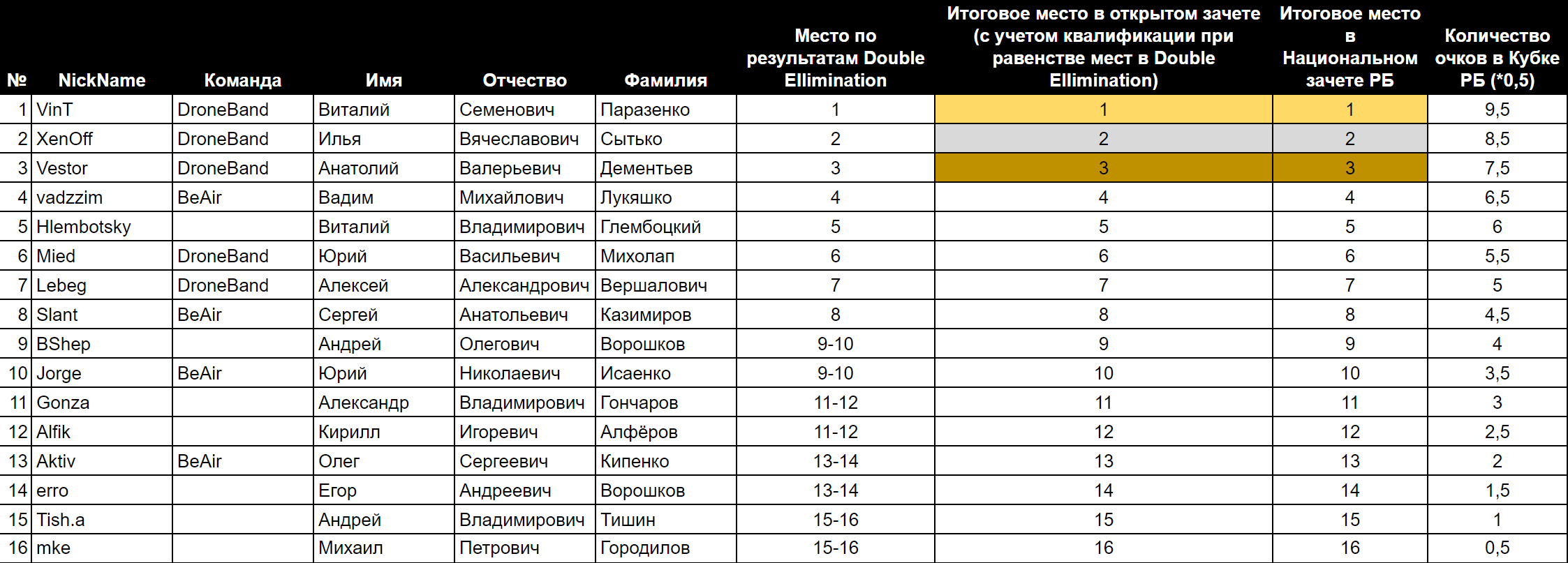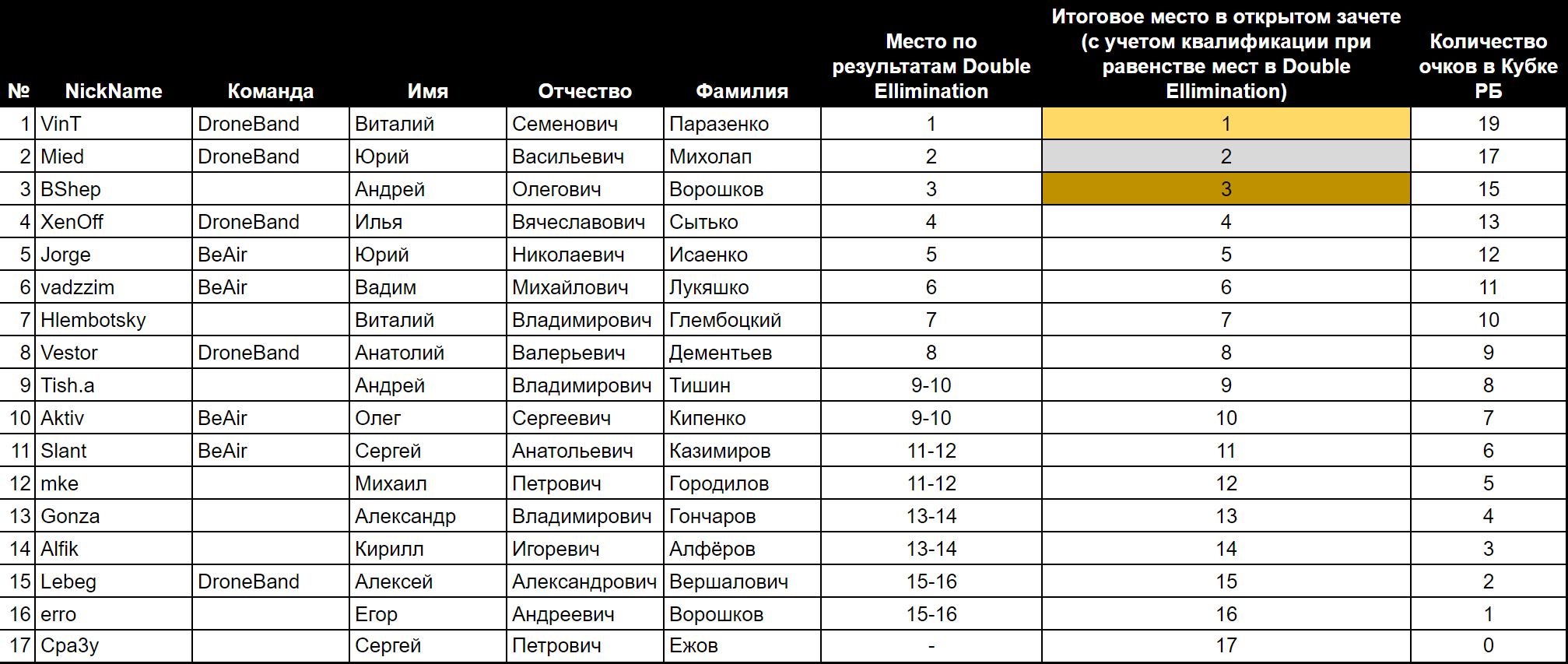 • 17:00 – 18:30 Супер финал для ТОП8 пилотов итогового рейтинга по результатам 3-х этапов. 8 человек. Группами по 4. 8 вылетов. Каждый пилот пролетит в 4-х группах. За вылеты зарабатываются очки как в финале дабла. При спорах – дуэли. По результатам супер финала пилотам будут начислены очки в общий рейтинг с коэффициентом 0.5.